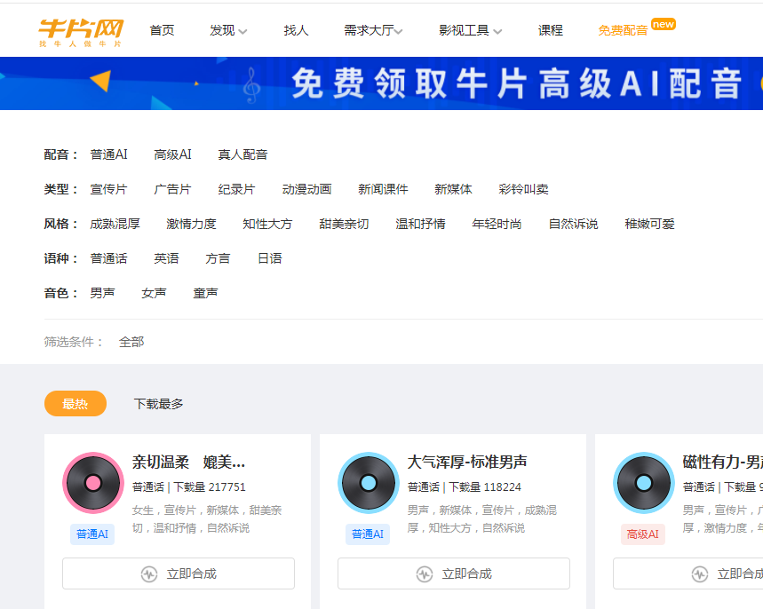 配音音源数量:免费声音21个,付费人工配音样音若干个